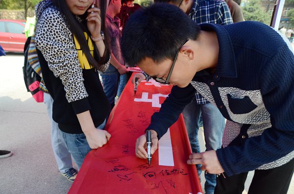 3月18日,best365官网于美食广场前开展了戒烟签名活动,活动由校风督察部与青年志愿团联合承办。一幅巨大的戒烟标语刚铺在摆点处,就吸引了众多同学自发前来签名,其中不乏很多女生。一位女生和她的男友在横幅上签下了俩人的名字,她说,她多次劝告男友戒烟都没有效果,这次赶上学院戒烟活动她是铁了心要让男友成功戒烟。当天,共有800余名同学在戒烟横幅上签名。