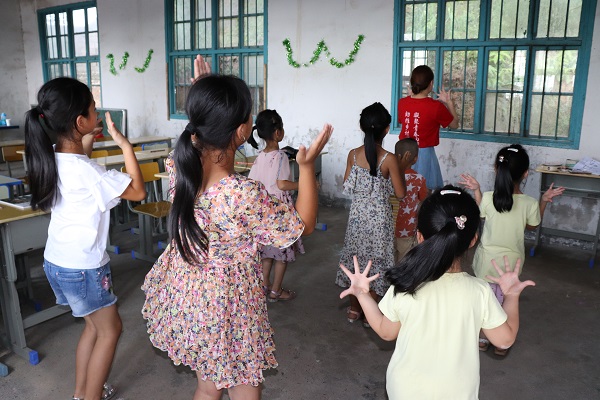 "一个一个梦飞出了天窗,一次一次想穿梭旧时光……"这正是本次三下乡团队成员江建梅教小朋友们唱的歌曲,教室里面不时地传出孩子们的欢声笑语。虽然怀化市的七月骄阳似火,但孩子们纯真眼睛中浓厚的求知欲,让所有志愿者们都为之动容,暂时忘记了天气的炎热。"由于条件有限,教室里没有风扇,所有孩子和老师全汗流浃背,但是所有人都在坚持,他们对知识的渴望完全超出了我们的想象,这些孩子们稚嫩的童声和热情洋溢的笑容让我们觉得这一切都是值得的。"此次三下乡团队成员王俣晴说道。